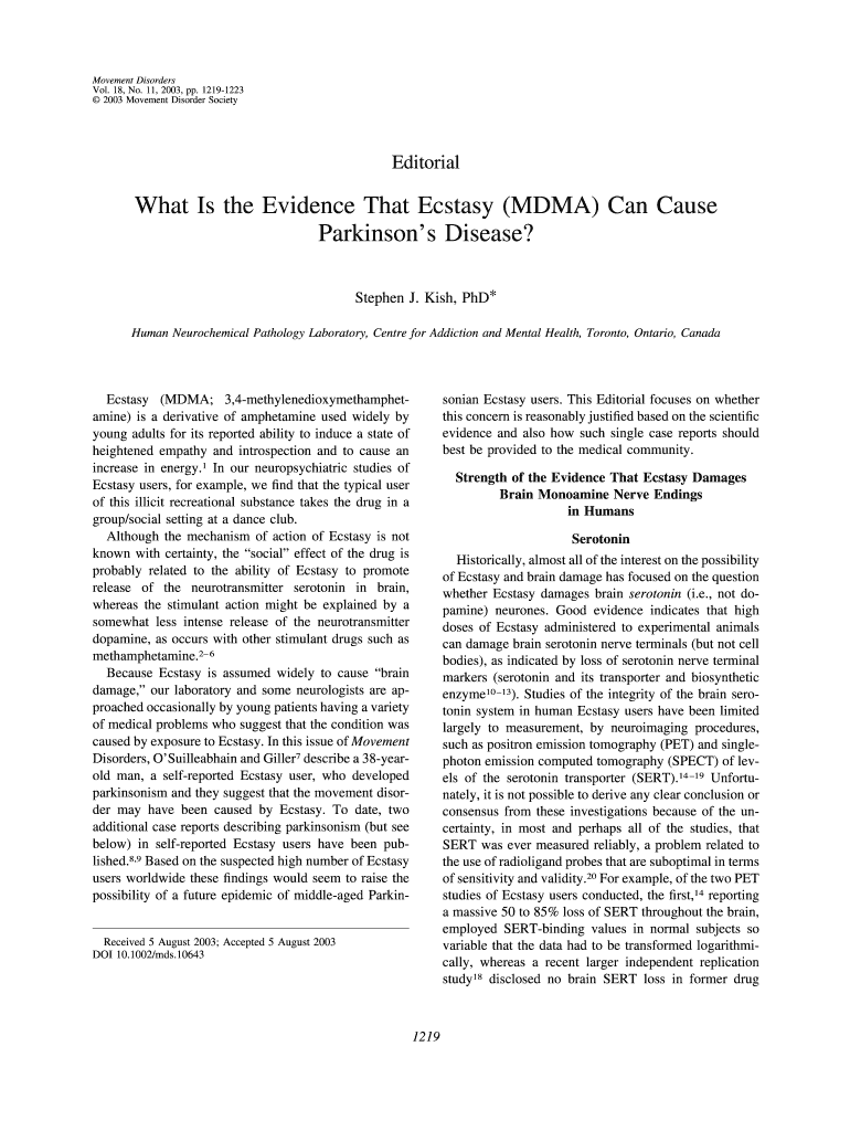 Movement Disorders Vol. 18, No. 11, 2003, pp. 12191223 2003 Movement Disorder SocietyEditorialWhat Is the Evidence That Ecstasy (MDMA) Can Cause Parkinson's Disease? Stephen J. Fish, PhD* Human Petrochemical