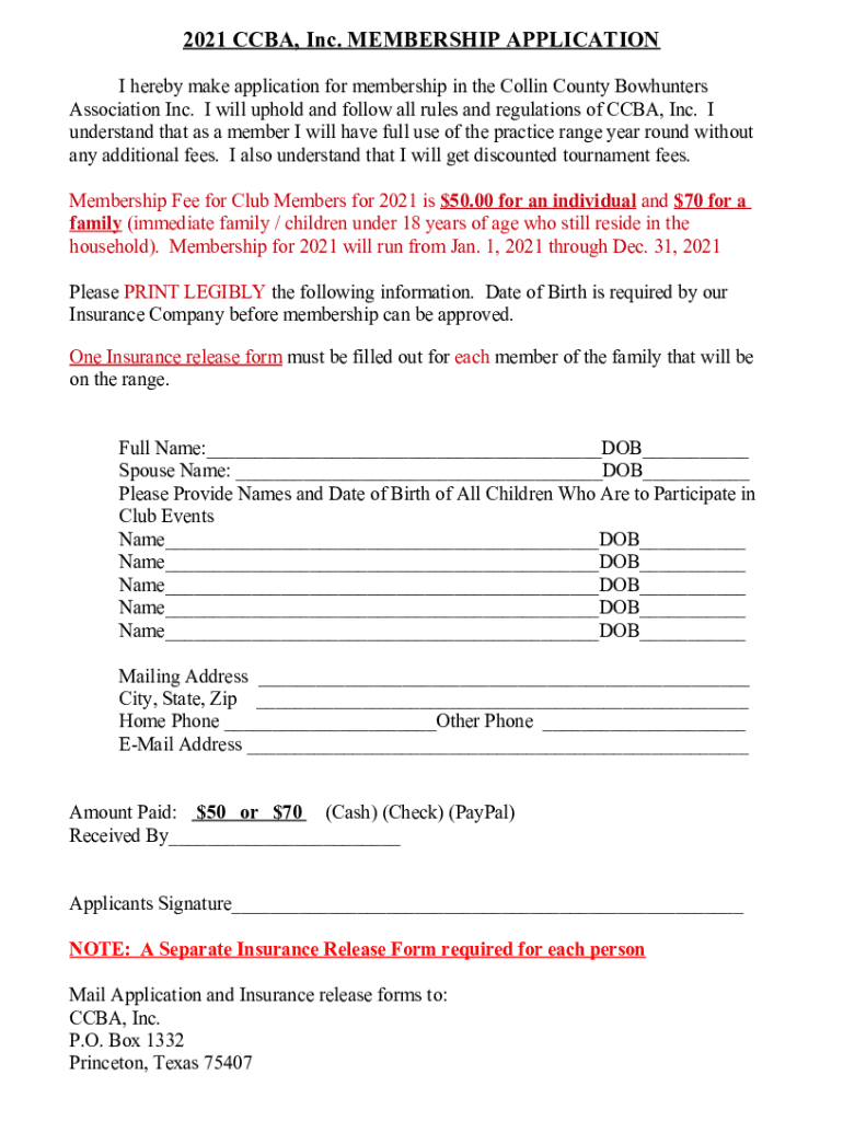 To fill out the Collin County Bowhunters Association registration form, individuals should provide their personal information, membership choices, and any necessary fees as indicated on the form.