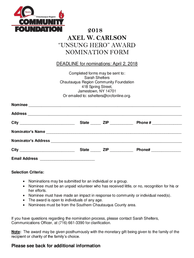 2018 AXEL W. CARLSON UNSUNG HERO AWARD NOMINATION FORM DEADLINE for nominations: April 2, 2018, Completed forms may be sent to: Sarah Shelters Chautauqua Region Community Foundation 418 Spring Street,
