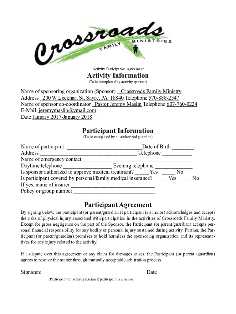 ! Activity Participation AgreementActivity Information (To be completed by activity sponsor)Name of sponsoring organization (Sponsor) Crossroads Family Ministry Address 200 W Lockhart St, Sabre, PA
