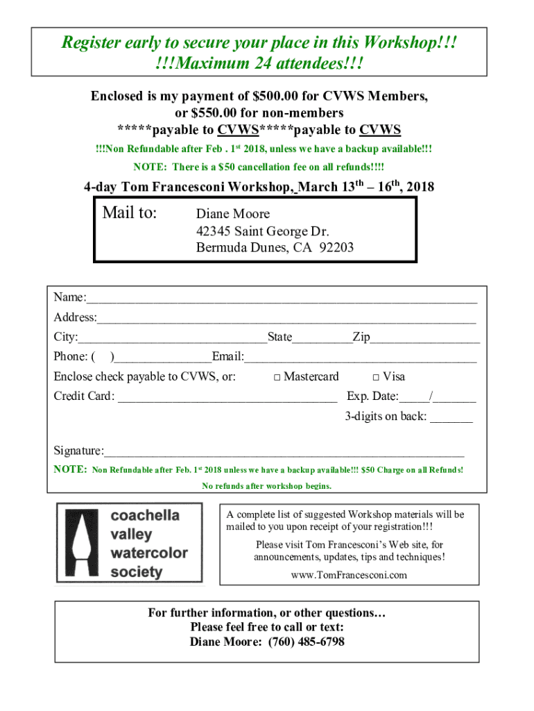 Register early to secure your place in this Workshop!!! !!! Maximum 24 attendees!!! Enclosed is my payment of $500.00 for COWS Members, or $550.00 for nonmembers *****payable to COWS*****payable to