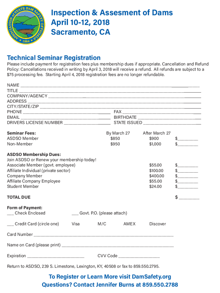 Inspection & Assessment of Dams April 1012, 2018 Sacramento, Technical Seminar RegistrationPlease include payment for registration fees plus membership dues if appropriate. Cancellation and Refund