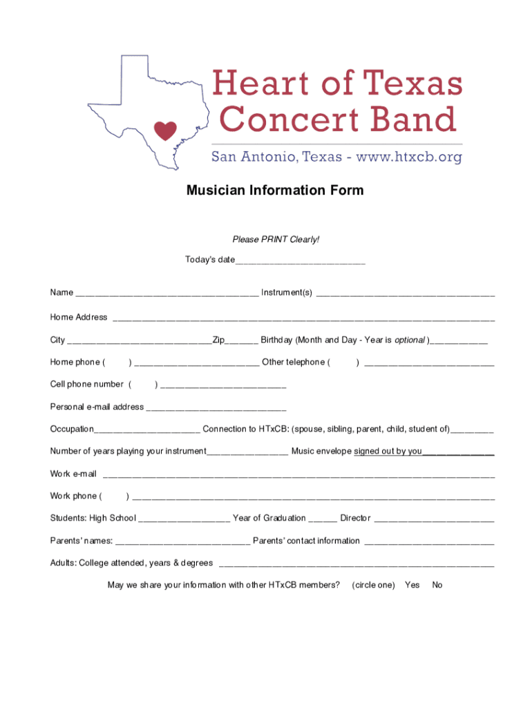Musician Information Formulas PRINT Clearly! Today's date Name Instrument(s) Home Address City Zip Birthday (Month and Day Year is optional) Home phone () Other telephone (Cell phone number ()) Personal