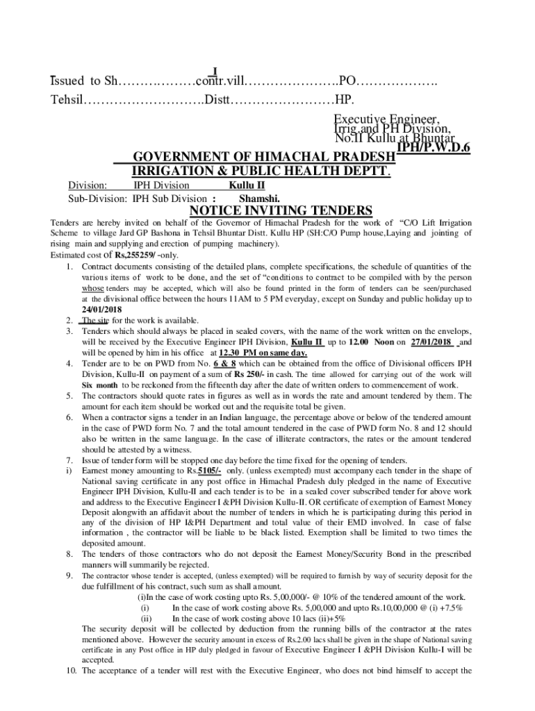 Issued to Second.will.PO. Thesis. Distant. Executive Engineer, Ir rig. And PH Division, No. II Full at Hunter MPH/P.W.D.6 GOVERNMENT OF HIMACHAL PRADESH IRRIGATION & PUBLIC HEALTH DEPTH. Division: