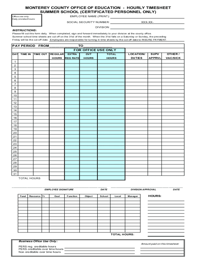 MONTEREY COUNTY OFFICE OF EDUCATION HOURLY TIMESHEET SUMMER SCHOOL (CERTIFICATED PERSONNEL ONLY) EMPLOYEE NAME (PRINT):Office use only: Daily prorated hours:SOCIAL SECURITY NUMBER:XXXXXDIVISION: INSTRUCTIONS: