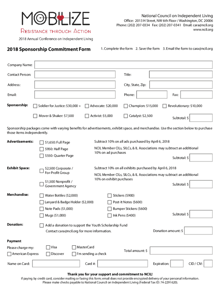 National Council on Independent Living Office: 2013 H Street, NW 6th Floor / Washington, DC 20006 Phone: (202) 2070334 Fax: (202) 2070341 Email: Carey Neil.org www.ncil.org2018 Sponsorship Commitment