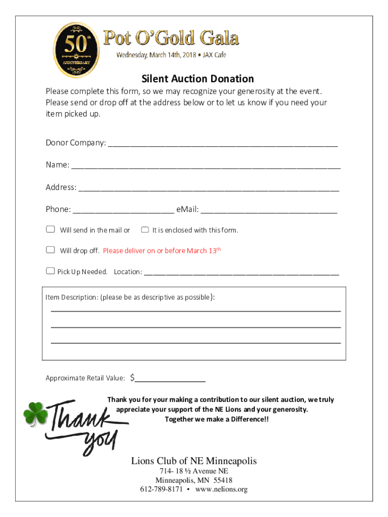 Silent Auction Donation Please complete this form, so we may recognize your generosity at the event. Please send or drop off at the address below or to let us know if you need your item picked up.