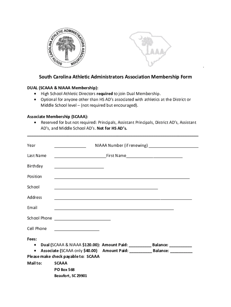 . South Carolina Athletic Administrators Association Membership Form DUAL (SCALA & NI AAA Membership): High School Athletic Directors required to join Dual Membership. Optional for anyone other than