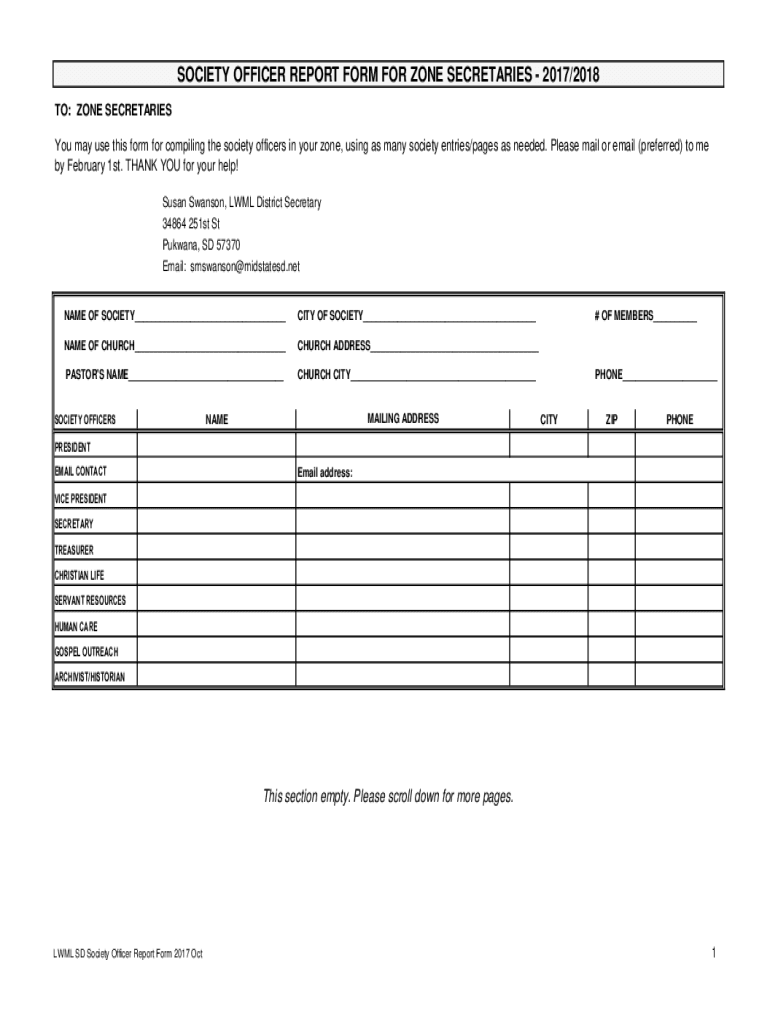 SOCIETY OFFICER REPORT FORM FOR ZONE SECRETARIES 2017/2018 TO: ZONE SECRETARIES You may use this form for compiling the society officers in your zone, using as many society entries/pages as needed.