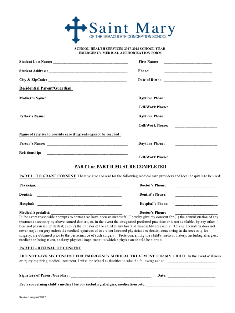 SCHOOL HEALTH SERVICES 20172018 SCHOOL YEAR EMERGENCY MEDICAL AUTHORIZATION FORMStudent Last Name: First Name: Student Address: Phone: City & Opcode: Date of Birth: Residential Parent/Guardian: Mothers