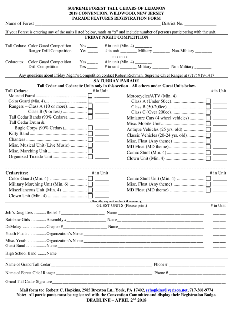 SUPREME FOREST TALL CEDARS OF LEBANON 2018 CONVENTION, WILDWOOD, NEW JERSEY PARADE FEATURES REGISTRATION Forename of Forest District No. If your Forest is entering any of the units listed below, mark