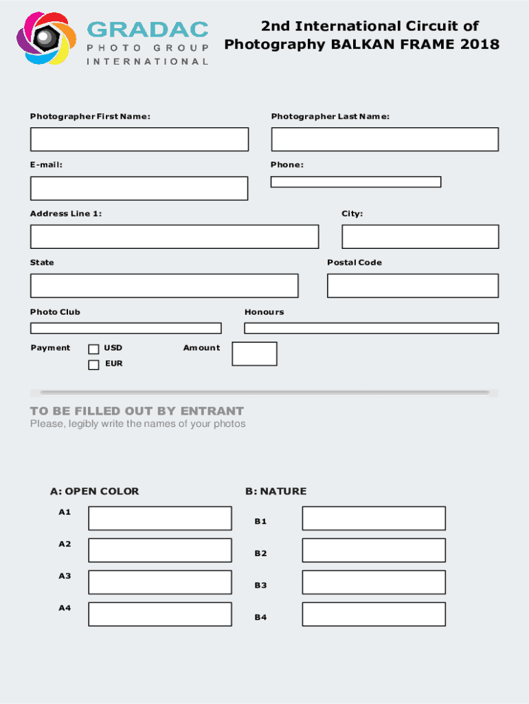 Photography BALKAN FRAME 2018Photographer First Name:Photographer Last Name:Email:Phone:Address Line 1:City:StatePostal Telephoto ClubPaymentHonoursUSDAmountEURTO BE FILLED