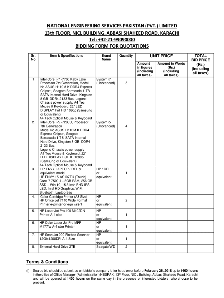 NATIONAL ENGINEERING SERVICES PAKISTAN (PVT.) LIMITED 13th FLOOR, NICE BUILDING, ABBAS SHAHEED ROAD, KARACHI Tel: +922199090000 BIDDING FORM FOR QUOTATIONS Sr. Noted & SpecificationsBrand NameQuantityUNIT