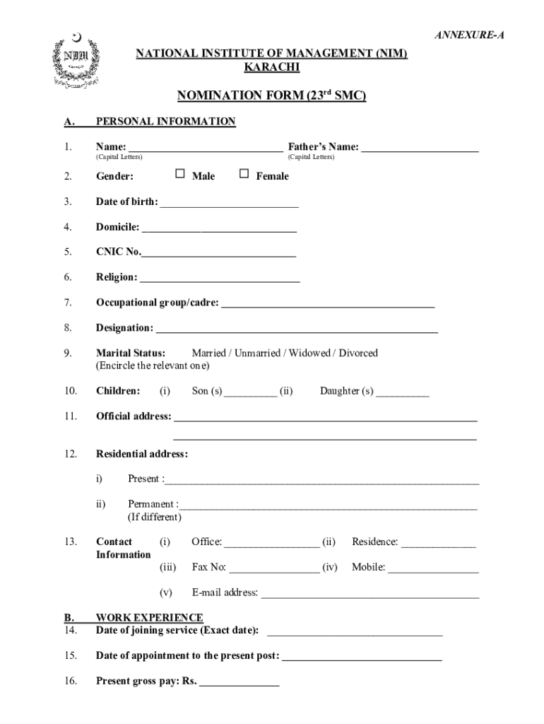 ANNEXUREANATIONAL INSTITUTE OF MANAGEMENT (HIM) KARACHINOMINATION FORM (23rd SMC) A.PERSONAL INFORMATION1. Name: Fathers Name: (Capital Letters)(Capital Letters)2. Gender:Male3. Date of birth: 4.