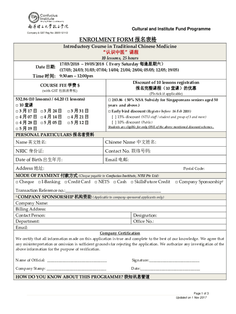 Cultural and Institute Fund Program Company & GST Reg No: 200511211DENROLMENT FORM Introductory Course in Traditional Chinese Medicine 10 lessons, 25 hours 17/03/2018 19/05/2018 Every Saturday Date