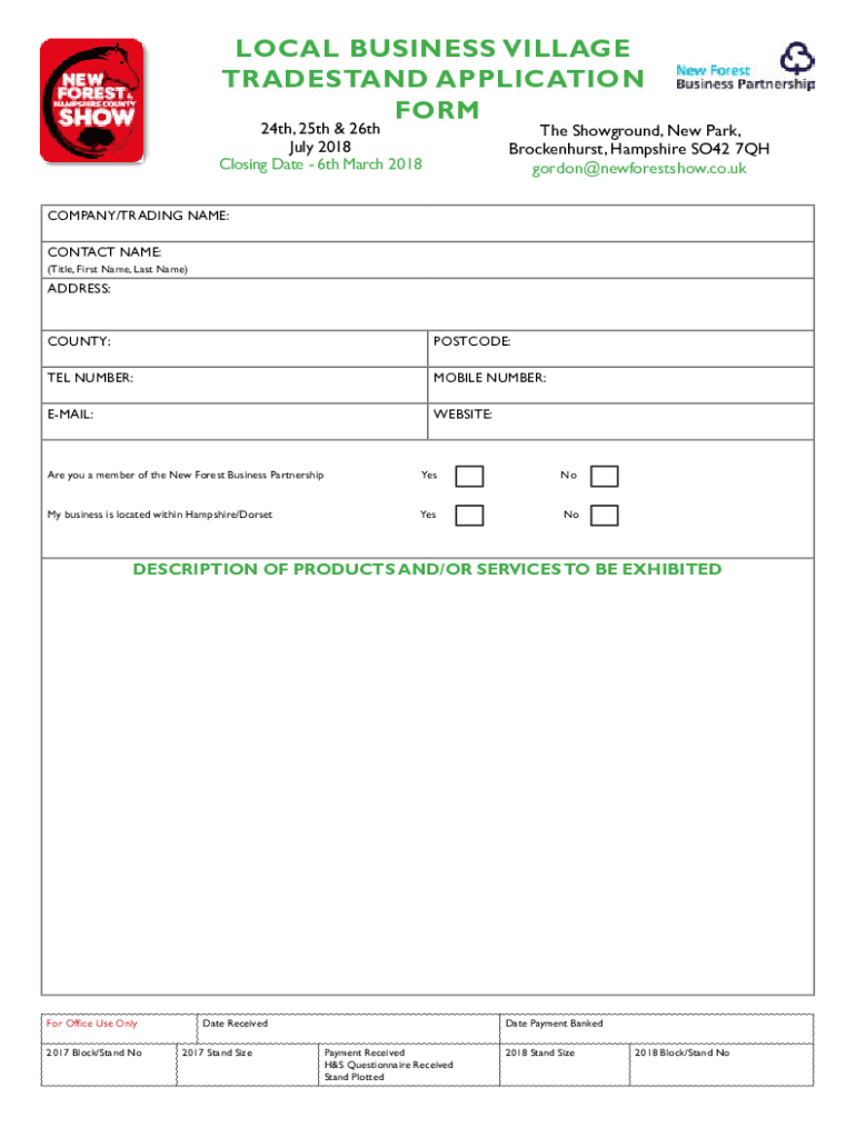 LOCAL BUSINESS VILLAGE TRADESMAN APPLICATION FORM24th, 25th & 26th July 2018 Closing Date 6th March 2018The Showground, New Park, Brockenhurst, Hampshire SO42 7QH Gordon newforestshow.co.ukCOMPANY/TRADING