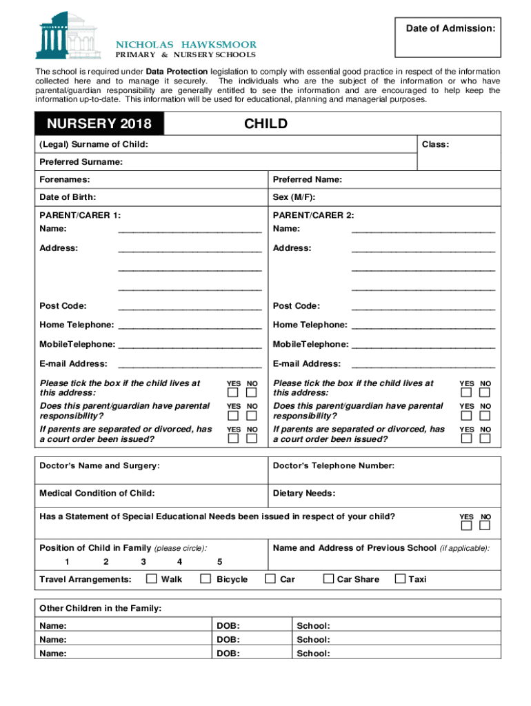 Date of Admission:NICHOLAS HAWKSMOOR PRIMARY & NURSERY Schools school is required under Data Protection legislation to comply with essential good practice in respect of the information collected here