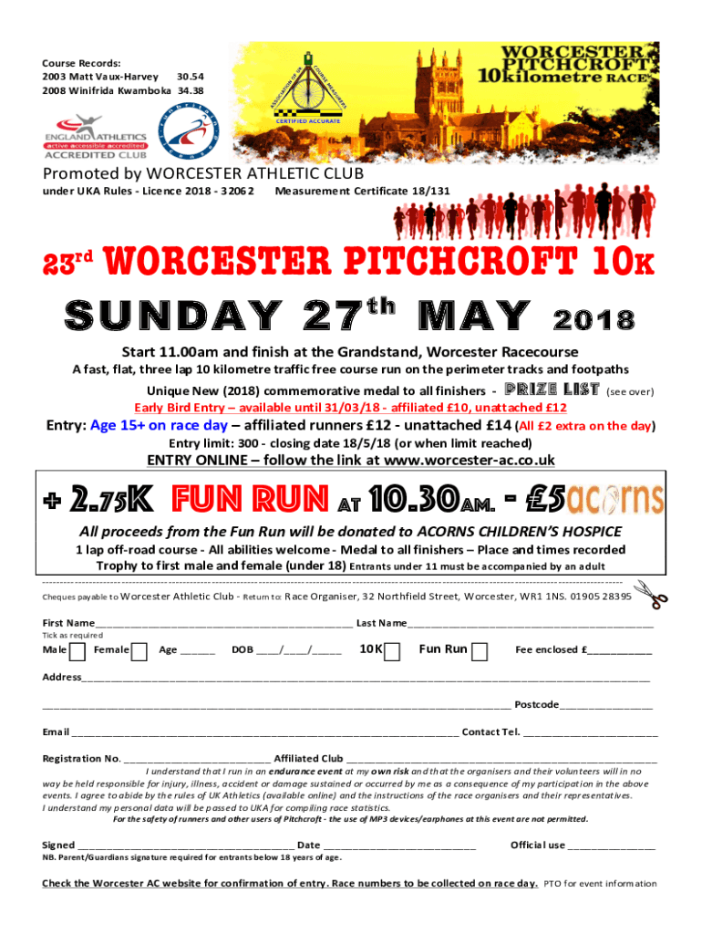 Course Records:2003 Matt VauxHarvey30.542008 Winifred Kwamboka34.38Promoted by WORCESTER ATHLETIC CLUB under UK Rules License 2018 32062Measurement Certificate 18/13123rdWORCESTER WITCHCRAFT 10KSUNDAY
