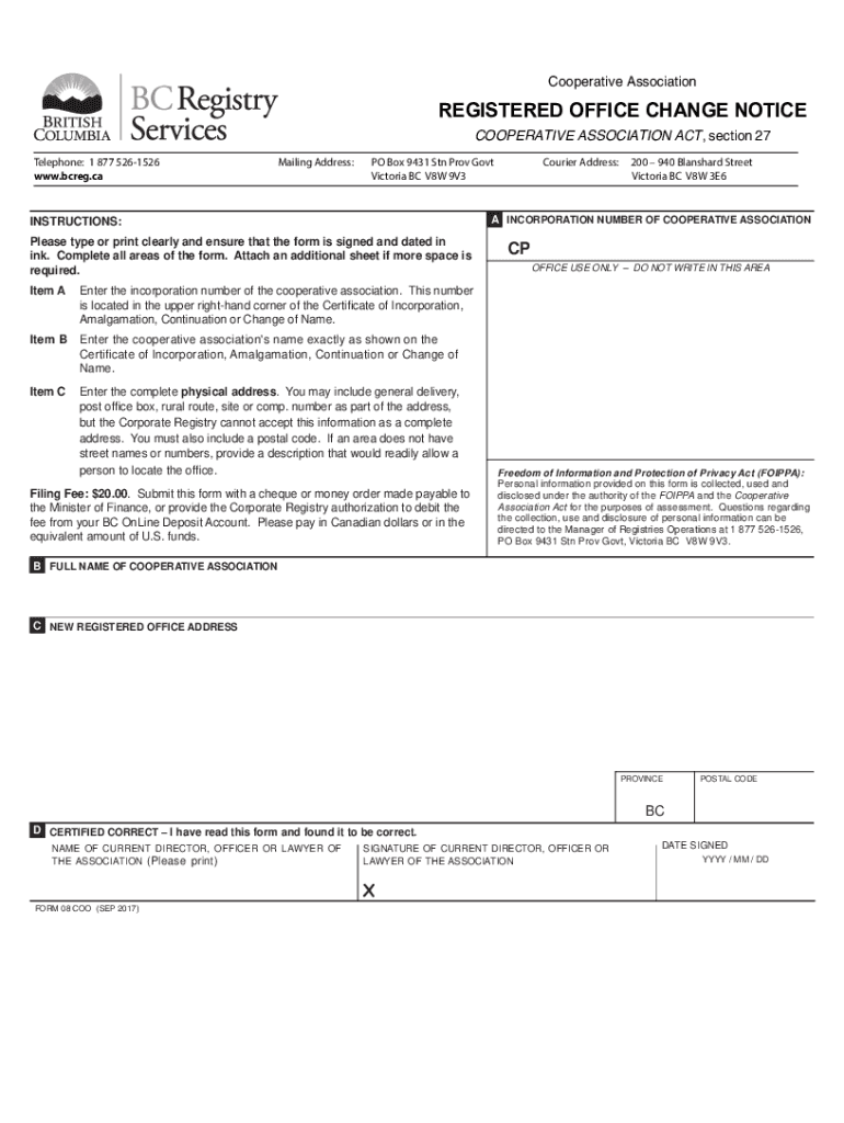 Cooperative AssociationREGISTERED OFFICE CHANGE NOTICE COOPERATIVE ASSOCIATION ACT, section 27Telephone: 1 877 5261526 www.bcreg.caMailing Address:PO Box 9431 STN Prov Govt Victoria BC V8W 9V3Courier