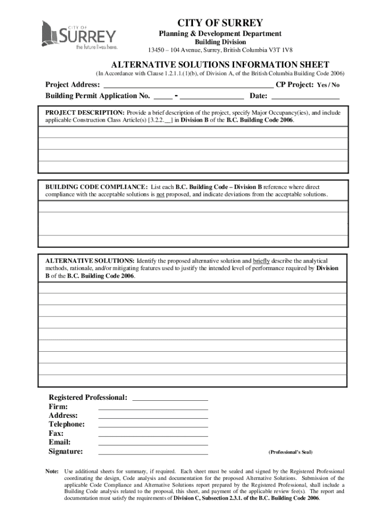 CITY OF SURREY Planning & Development Department Building Division 13450 104 Avenue, Surrey, British Columbia V3T 1V8ALTERNATIVE SOLUTIONS INFORMATION SHEET (In Accordance with Clause 1.2.1.1.(1)(b),