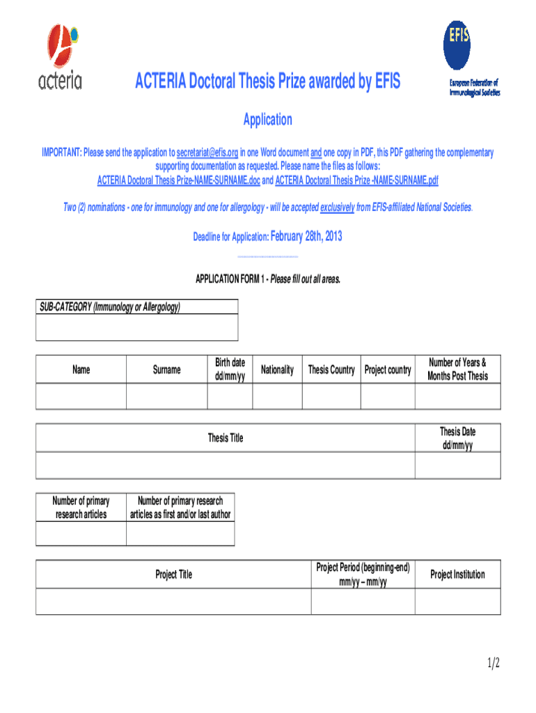 BACTERIA Doctoral Thesis Prize awarded by ERIS Application IMPORTANT: Please send the application to secretariat Eris.org in one Word document and one copy in PDF, this PDF gathering the complementary