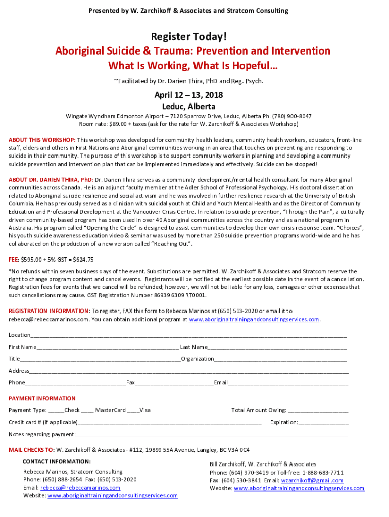 Presented by W. Zarchikoff & Associates and Stratum ConsultingRegister Today! Aboriginal Suicide & Trauma: Prevention and Intervention What Is Working, What Is Hopeful Facilitated by Dr. Darren Third,