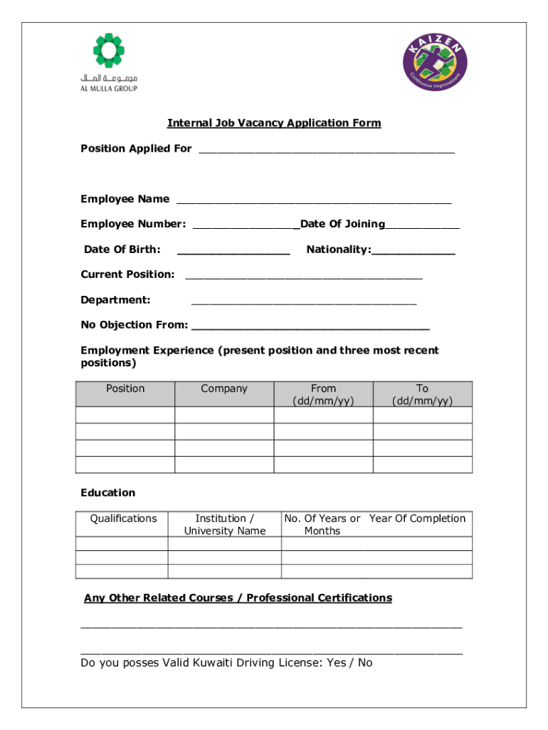 Internal Job Vacancy Application Form Position Applied For Employee Name Employee Number: Date Of Joining Date Of Birth: Current Position: Department: Nationality: No Objection From: Employment Experience