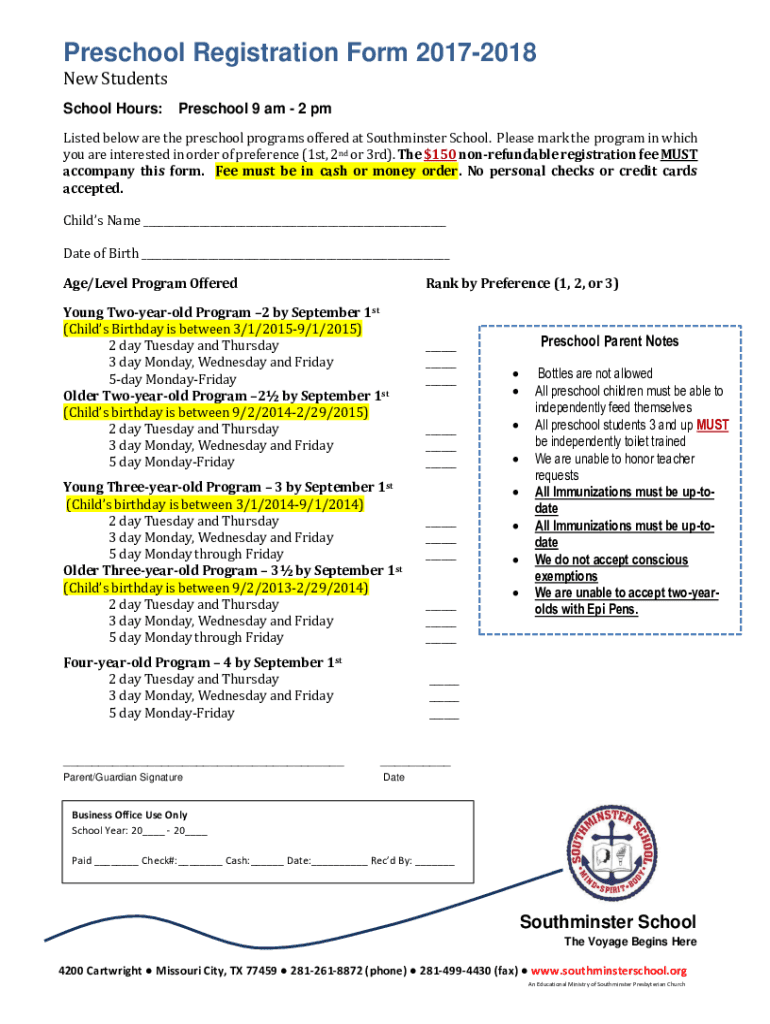 Preschool Registration Form 20172018 New Students School Hours:Preschool 9 am 2 listed below are the preschool programs offered at South minster School. Please mark the program in which you are interested