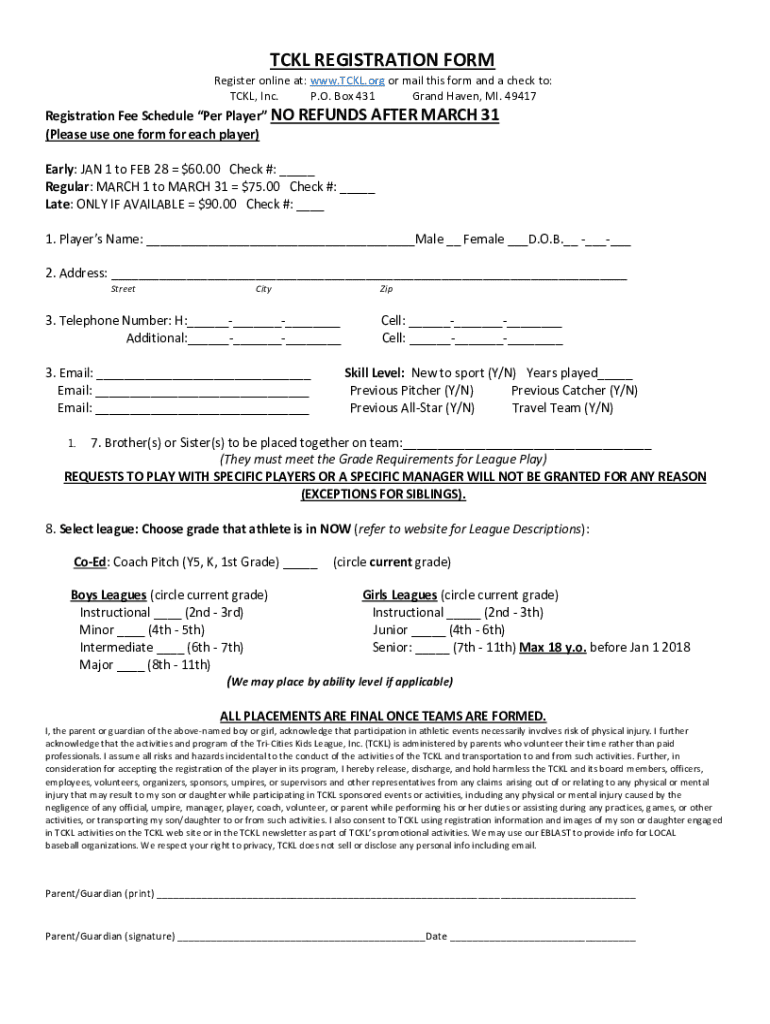 TCK REGISTRATION FORM Register online at: www.TCKL.org or mail this form and a check to: TCK, Inc. P.O. Box 431 Grand Haven, MI. 49417Registration Fee Schedule Per Player NO REFUNDS AFTER MARCH 31