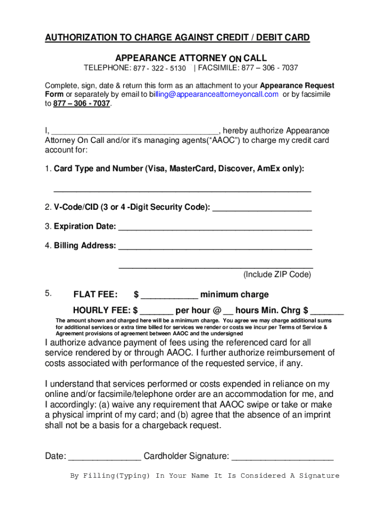 AUTHORIZATION TO CHARGE AGAINST CREDIT / DEBIT CARD APPEARANCE ATTORNEY ON OF CALLTELEPHONE: 877 877 322 322 5130 7037 FACSIMILE: 877 306 7037 Complete, sign, date & return this form as an attachment