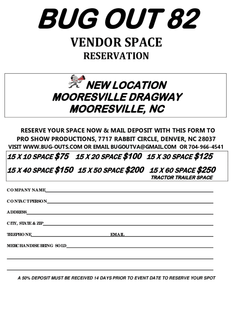 BUG OUT 82 VENDOR SPACE RESERVATION LOCATION MOORESVILLE TRAMWAY MOORESVILLE, NC RESERVE YOUR SPACE NOW & MAIL DEPOSIT WITH THIS FORM TO PRO SHOW PRODUCTIONS, 7717 RABBIT CIRCLE, DENVER, NC 28037VISIT
