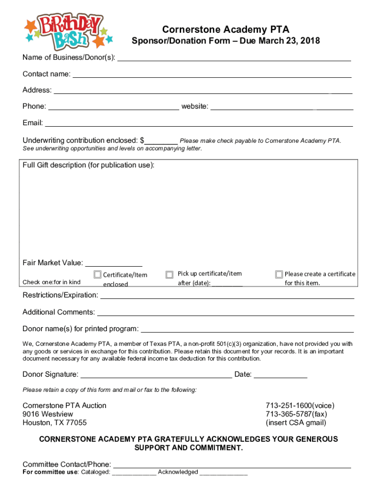 Cornerstone Academy PTA Sponsor/Donation Form Due March 23, 2018, Name of Business/Donor(s): Contact name: Address: Phone: website: Email: Underwriting contribution enclosed: $ Please make check payable