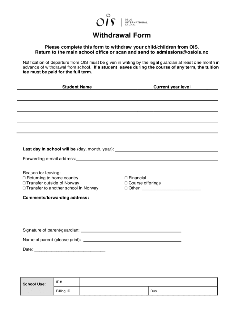 Indicate the reason for the withdrawal, whether it is due to relocation, transfer to another school, or any other valid reason.