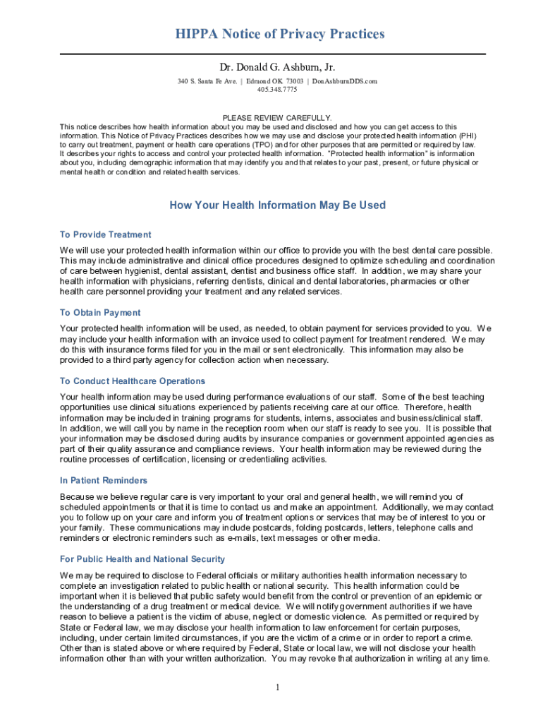 HIPPO Notice of Privacy Practices Dr. Donald G. Ashburn, Jr. 340 S. Santa Fe Ave. Edmond OK 73003 DonAshburnDDS.com 405.348.7775PLEASE REVIEW CAREFULLY. This notice describes how health information
