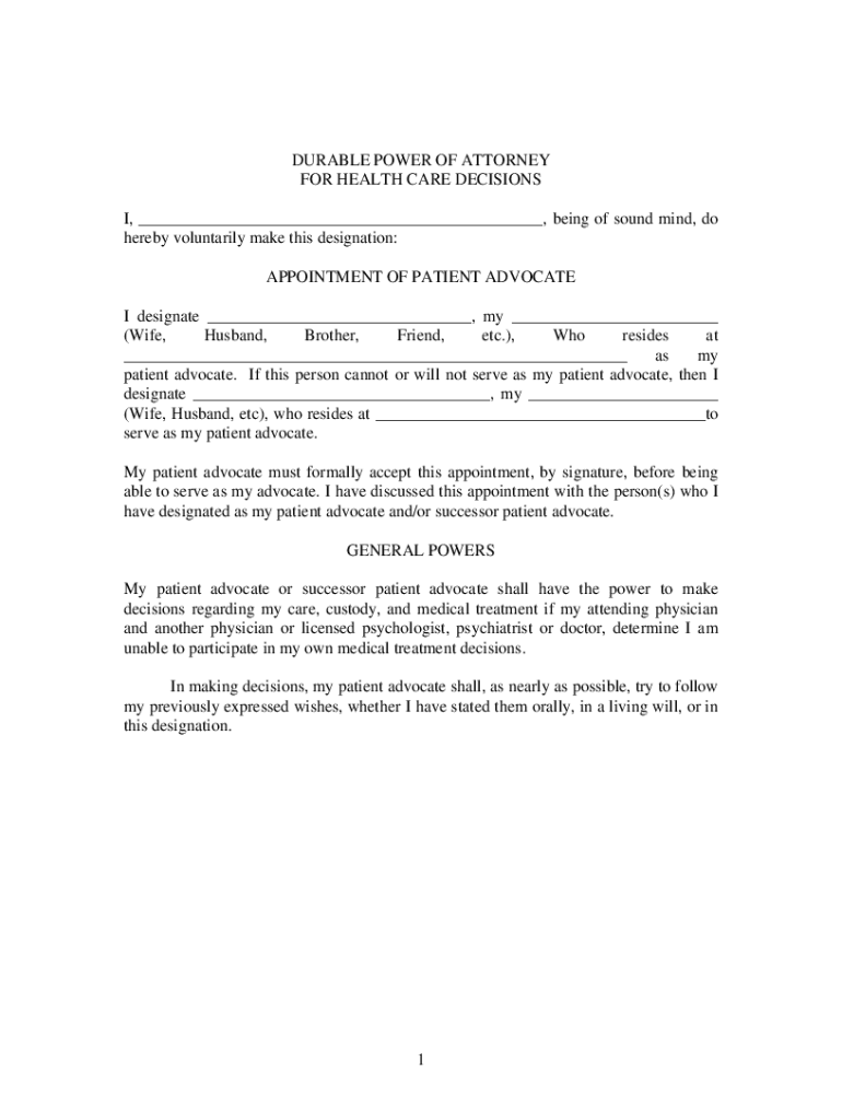 DURABLE POWER OF ATTORNEY FOR HEALTH CARE DECISIONS I, being of sound mind, do hereby voluntarily make this designation: APPOINTMENT OF PATIENT ADVOCATE I designate, my (Wife, Husband, Brother, Friend,