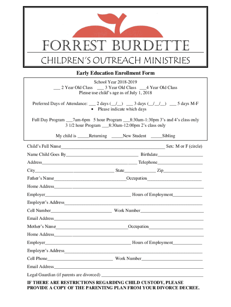 FORREST BURETTE CHILDREN OUTREACH MINISTRIES Early Education Enrollment Form School Year 20182019 2-Year-Old Class 3-Year-Old Class 4-Year-Old Class Please use children as of July 1, 2018, Preferred