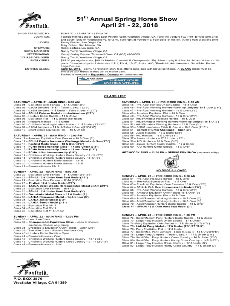 51st Annual Spring Horse Show April 21 22, 2018 SHOW APPROVED BY: LOCATION: JUDGES: STEWARD: SHOW MANAGER: VETERINARIAN: COURSE DESIGNER: ENTRY FEES: ENTRIES CLOSE:PCHA “C / LAH JA “A / SFH JA