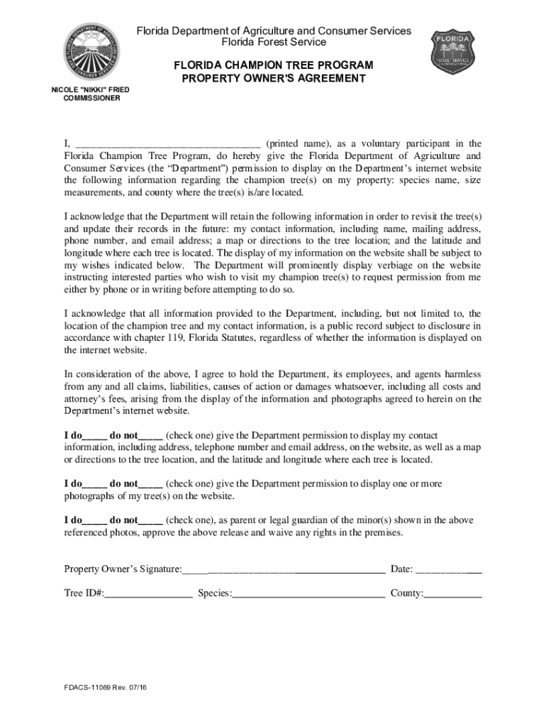 Florida Department of Agriculture and Consumer Services Florida Forest ServiceNICOLE “NIKKI FRIED COMMISSIONERFLORIDA CHAMPION TREE PROGRAM PROPERTY OWNER IS AGREEMENT, (printed name), as a voluntary