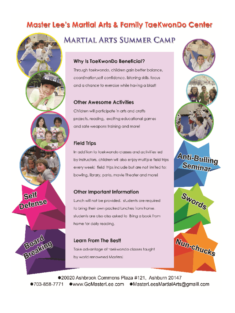 WELCOME! As a registered summer camper at Master Lees Martial Arts your child can look forward to an exciting and rewarding summer. We are sure, whether they will be with us for just a week or for