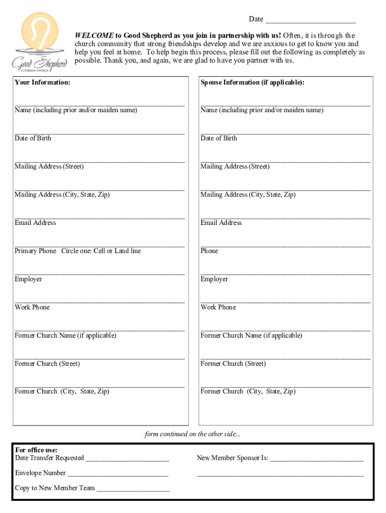 Date WELCOME to Good Shepherd as you join in partnership with us! Often, it is through the church community that strong friendships develop, and we are anxious to get to know you and help you feel