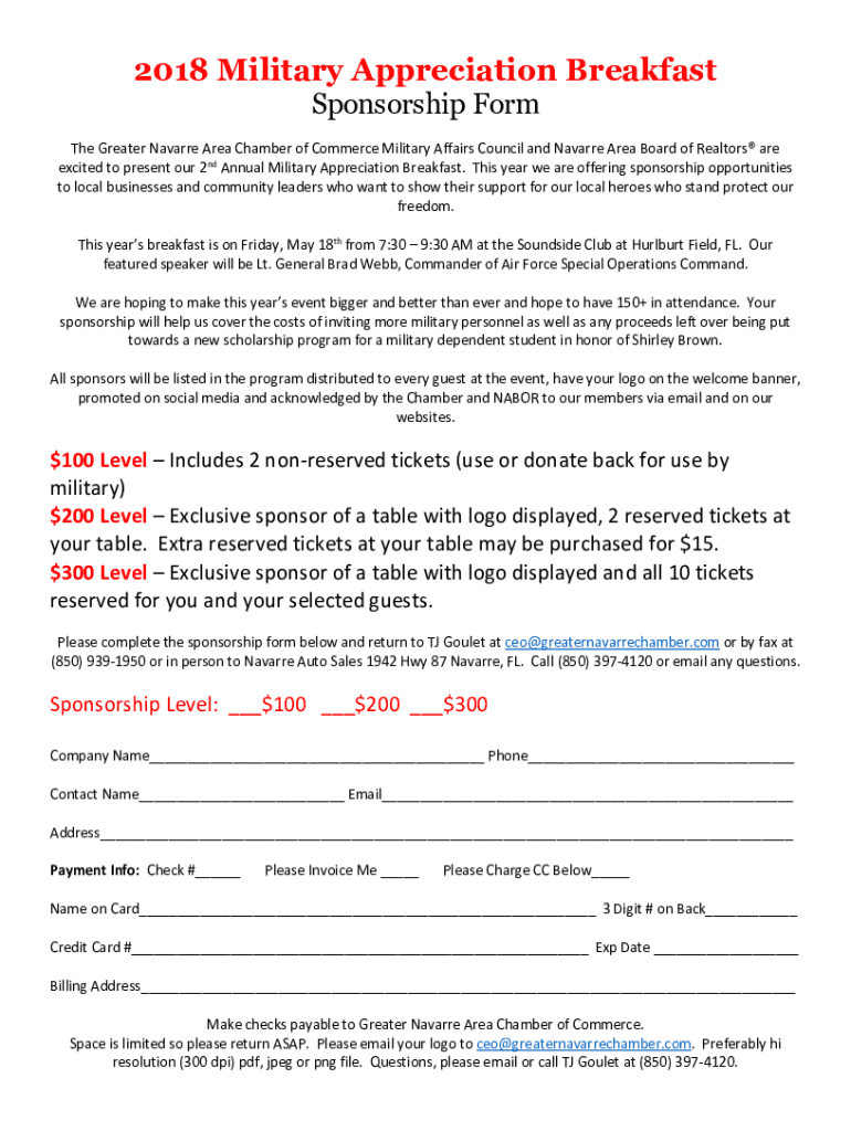 2018 Military Appreciation Breakfast Sponsorship Form The Greater Navarre Area Chamber of Commerce Military Affairs Council and Navarre Area Board of Realtors are excited to present our 2nd Annual