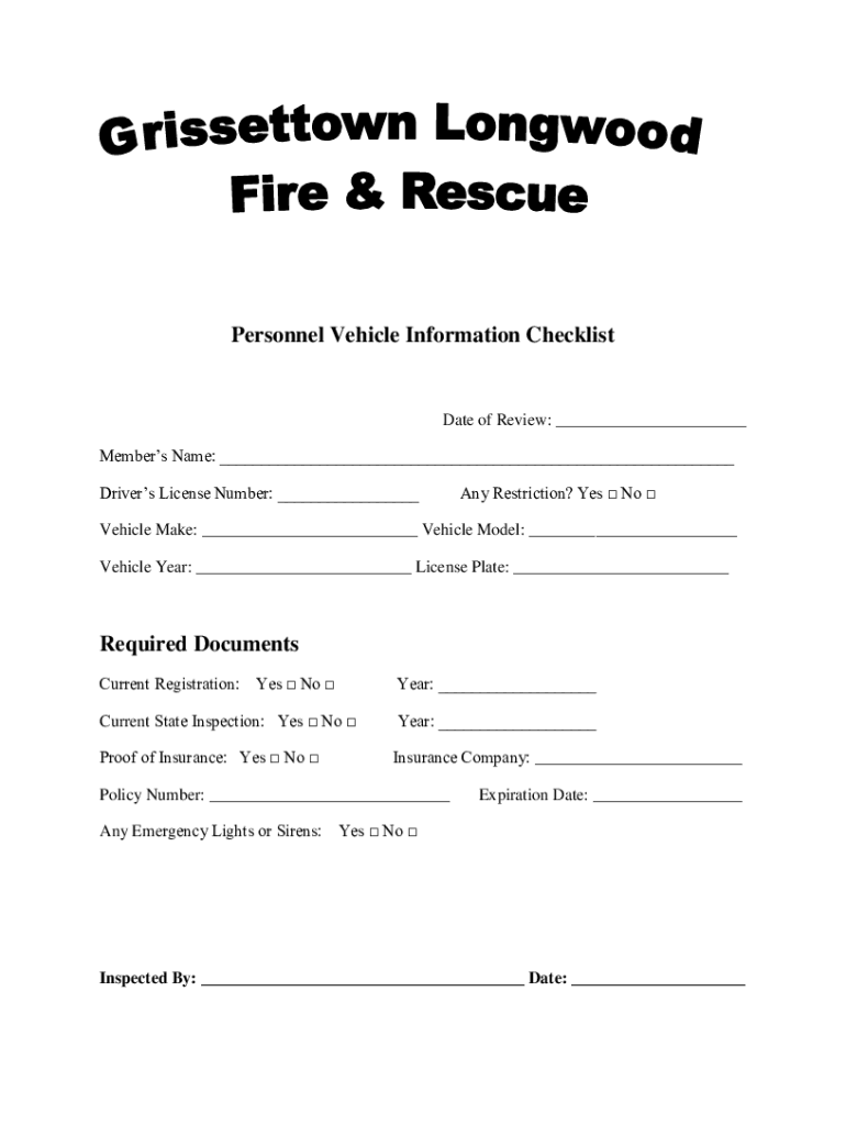 Personnel Vehicle Information ChecklistDate of Review: Members Name: Driver's License Number: Any Restriction? Yes No Vehicle Make: Vehicle Model: Vehicle Year: License Plate: Required Documents Current