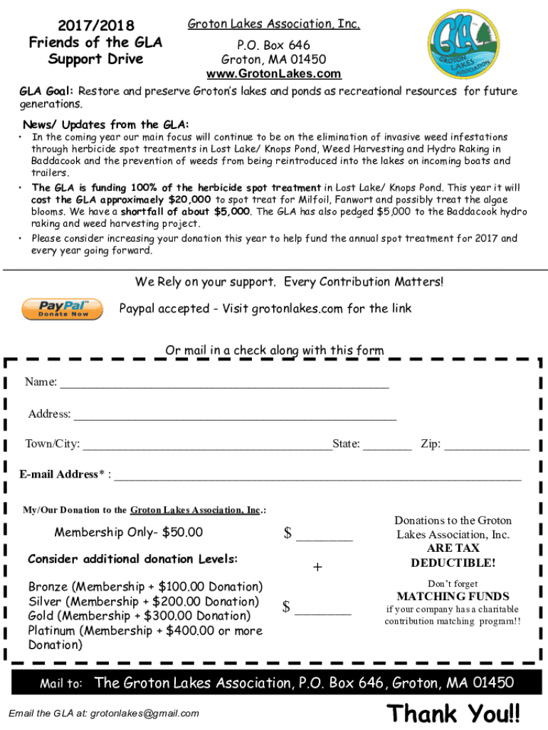 www.GrotonLakes.comGLA Goal: Restore and preserve Protons lakes and ponds as recreational resources