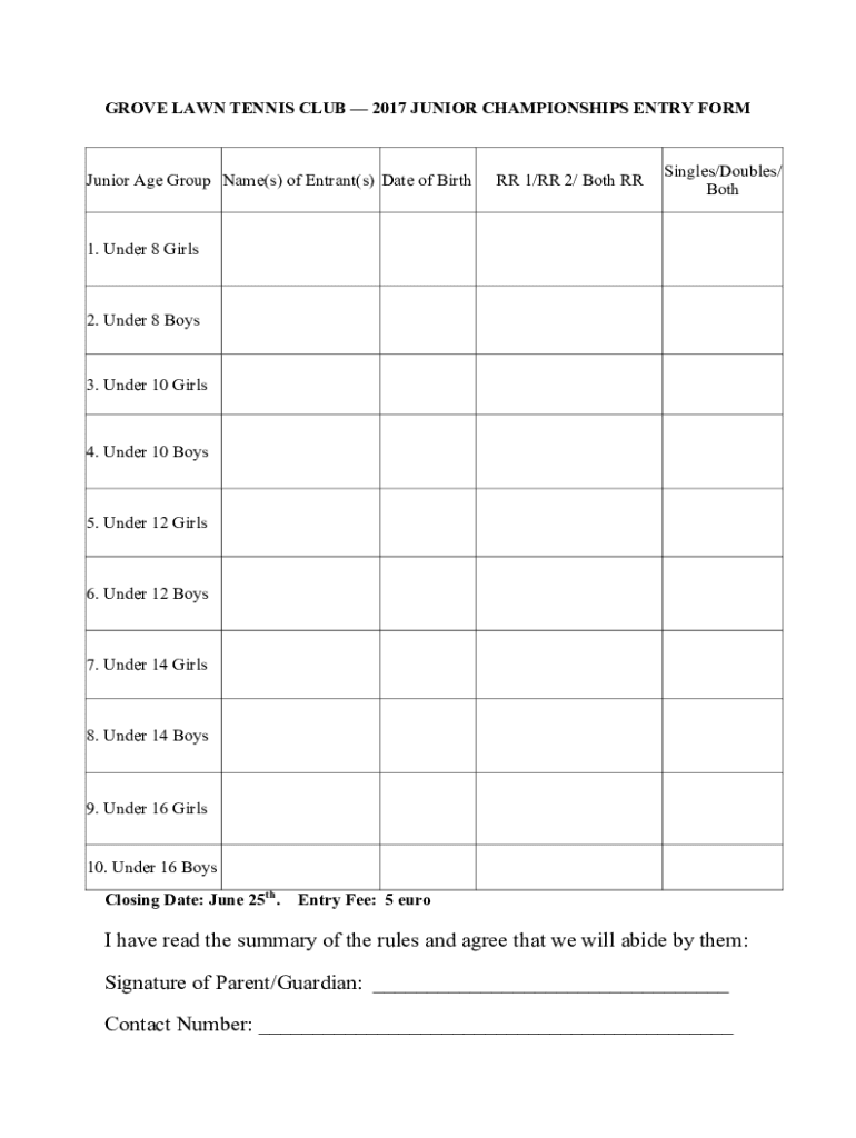 GROVE LAWN TENNIS CLUB 2017 JUNIOR CHAMPIONSHIPS ENTRY FORM Junior Age Group Name(s) of Entrant(s) Date of Birther 1/RR 2/ Both Singles/Doubles/ Both1. Under 8 Girls2. Under 8 Boys3. Under 10 Girls4.
