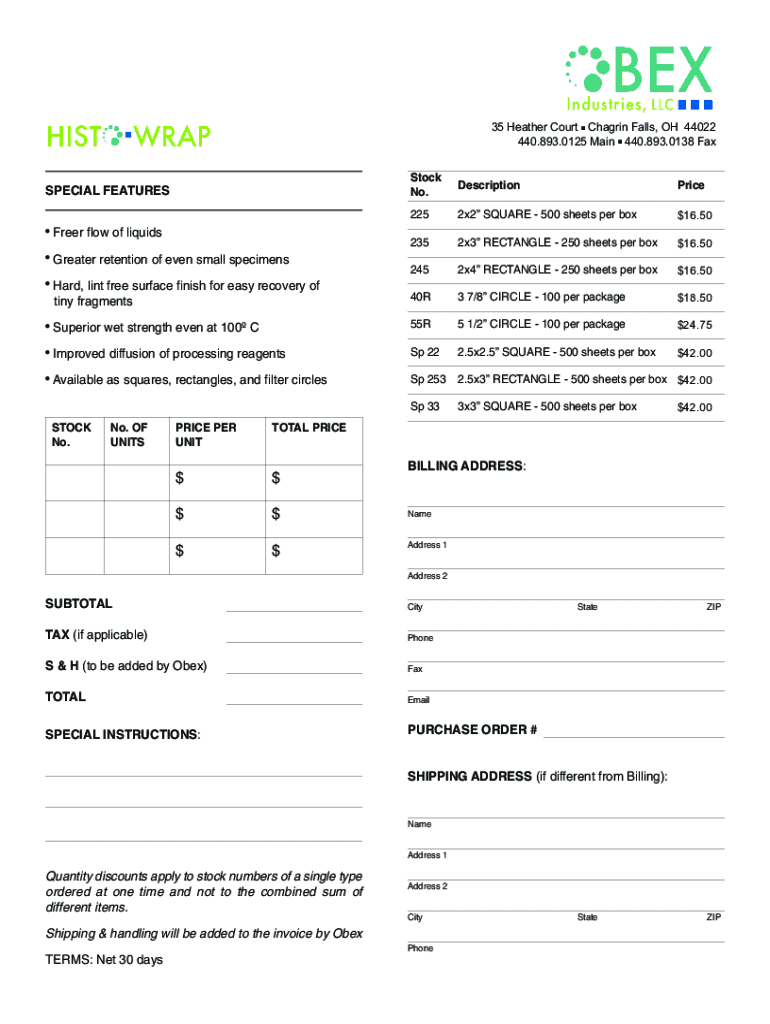 35 Heather Court I Chagrin Falls, OH 44022 440.893.0125 Main I 440.893.0138 Special FEATURES Freer flow of liquids Greater retention of even small specimensStock No. DescriptionPrice2252x2 SQUARE