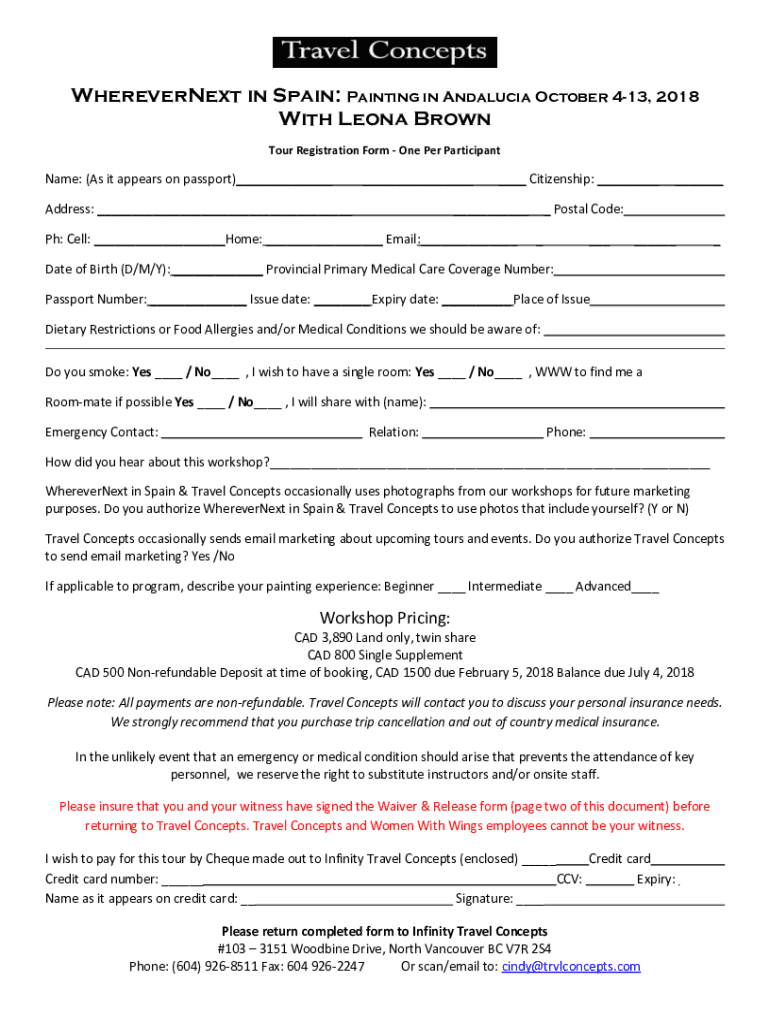 WhereverNext in Spain: Painting in Andalusia October 413, 2018 With Leona Brown Tour Registration Form One Per ParticipantName: (As it appears on passport) Address: Citizenship: pH: Cell: Home: Email: