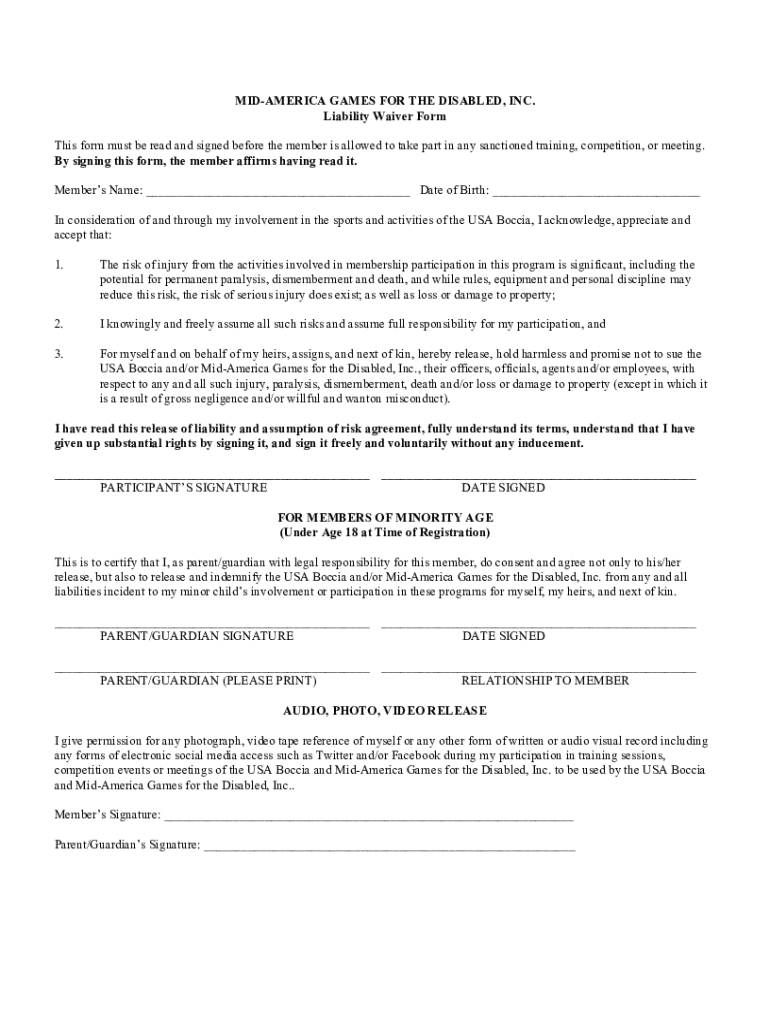 Mid-America GAMES FOR THE DISABLED, INC. Liability Waiver Form This form must be read and signed before the member is allowed to take part in any sanctioned training, competition, or meeting. By signing