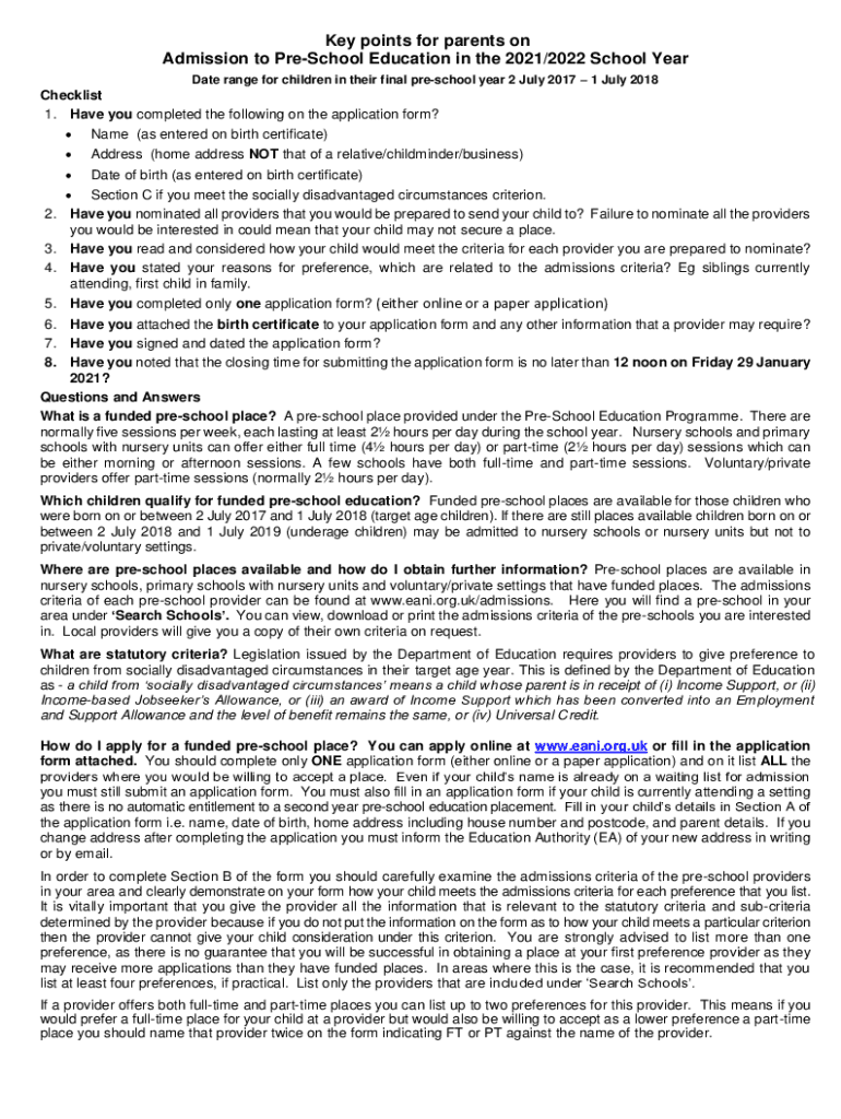 Key points for parents on Admission to Preschool Education in the 2021/2022 School Year Date range for children in their final preschool year 2 July 2017 1 July 2018Checklist 1. Have you completed