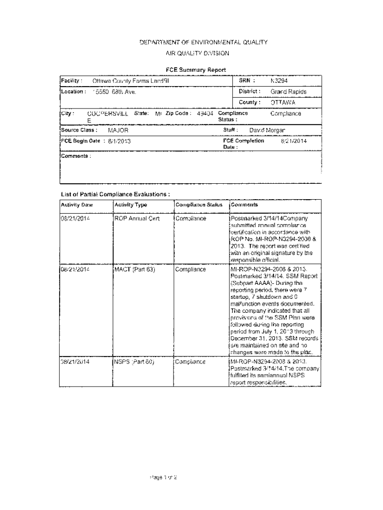 Facility :Ottawa County Farms LandfillS RN:N3294Location:15550 68th Ave. District:Grand RapidsCounty:OTTAWACity:COOPERSVILL