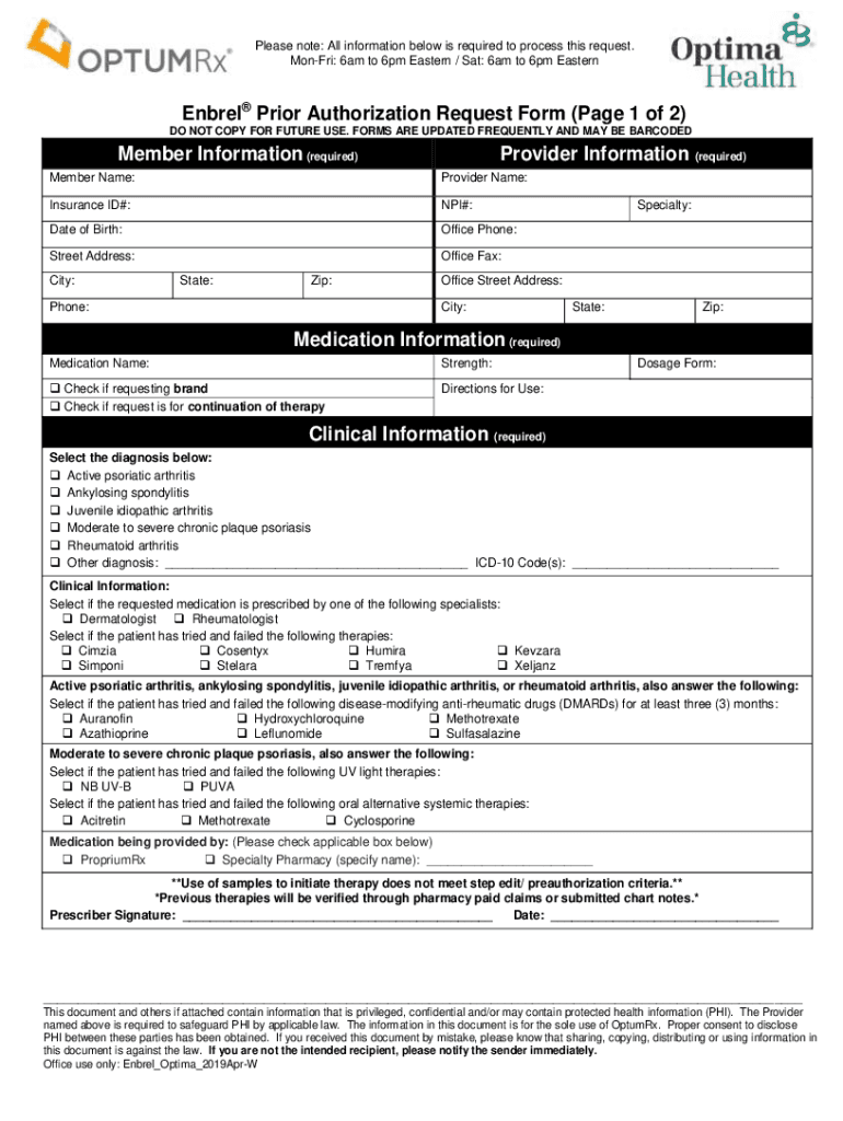 Mon Fri: 6am to 6pm Eastern / Sat: 6am to 6pm EasternEnbrel Prior Authorization Request Form (Page 1 of 2)